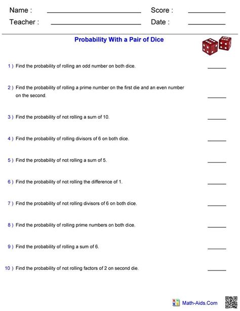 Web practice different types of rolling dice probability questions like probability of rolling a die, probability for rolling two dice simultaneously and probability for rolling three dice. Browse thousands of other free teacher created activities, lessons, worksheets and more… Web these probability worksheets will produce problems with simple numbers, sums, differences, multiples, divisors, and factors using a pair of dice.