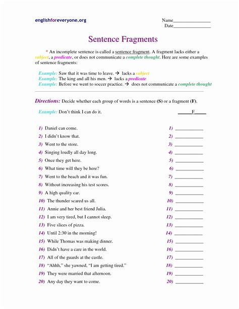 Worksheet answer keys find the fragments a sentence fragment is. Download and print this english worksheets for your kids or student. If it is a fragment, write f on the line.